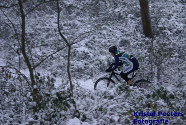 De volgende rondes kwam ik alleen te rijden, maar het liep niet lekker, weinig vertrouwen in de afdalingen, want het was overal erg glad. Halverwege de wedstrijd sloot Sandro Harings aan en hij ging erop en erover, probeerde nog even aan te sluiten maar dat was maar een halve ronde. Ondertussen was het steeds glijen geblazen en moest ik vaak een voetje aan de grond zetten.
