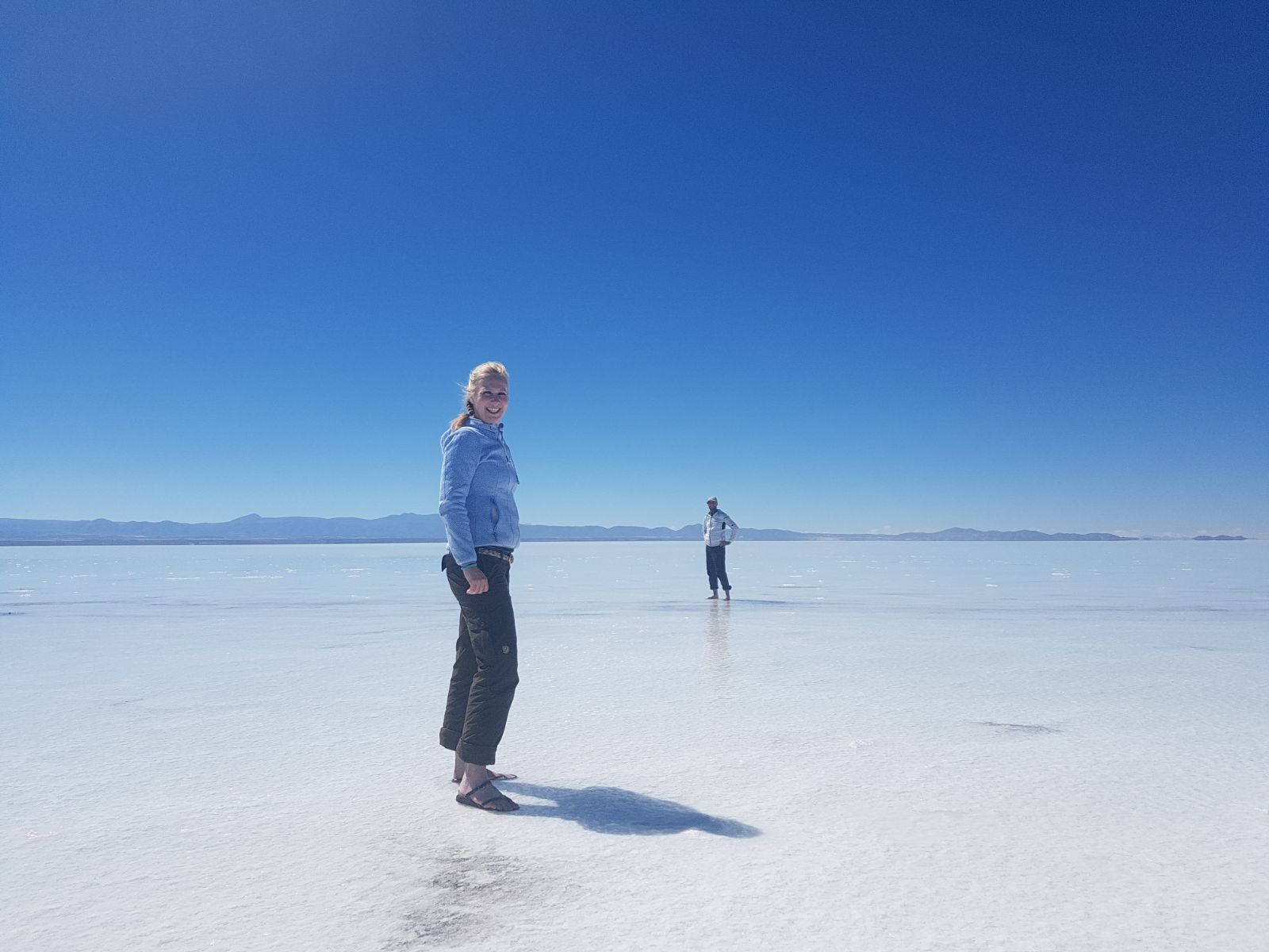 De eerste stop van deze nieuwe dag was bij rotsen met zeer aparte vormen, genaamd Valle de Rocas. Zo heeft William kameel gereden in de woestijn op de Camello de piedra, hebben we de Cop del Mundo gezien en een foto momentje bij de Italia Perida. De route ging verder langs Laguna Vinto waar de lama's aan het eten en drinken waren. Laguna Negra was schitterend, verscholen achter rotsformaties en onze chauffeur wist een mooie route naar deze plek. De Valley of Anacondas volgde met een uitzicht over de slingerende rivier in de vallei. Onze lunch was in Alota waarna we naar het mijnplaatsje San Cristóbal zijn gereden. Deze stad is enkele jaren geleden compleet verplaatst omdat er op de oude locatie zilver in de grond zat. Onze laatste stop was bij het verlaten Train Cementry van Uyuni. De verroeste treinen en wagons zijn hier meer dan een halve eeuw geleden achter gelaten en nooit meer gebruikt. Ons hotel voor de nacht was een echt zouthotel, de muren en het bed waren allemaal van zout gemaakt. Dit hoorde natuurlijk bij de ervaring van de zoutvlakte van Uyuni. Ook deze dag was er weer een om in te lijsten, wat een gave natuur!