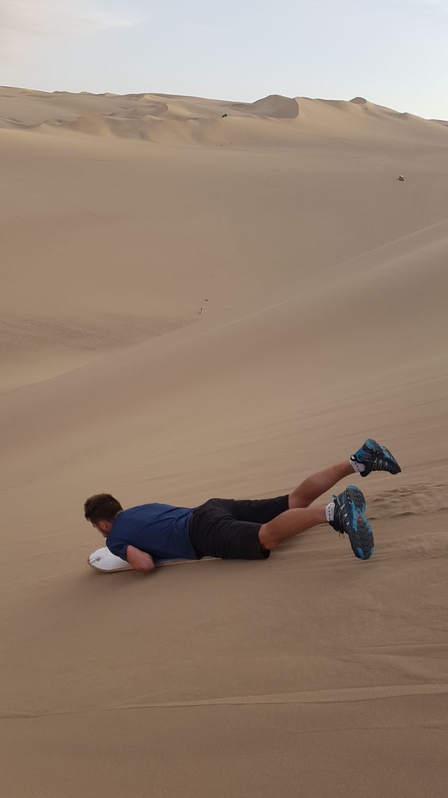 Na eerst heerlijk uitslapen, hebben we erna aan het zwembad gelegen vandaag. Beetje zwemmen, relaxen en in de hangmat liggen. Om 4 uur kon de echte fun van de dag starten, namelijk de zandduinen in met een buggy. Met 10 man in de zandbuggy en de chauffeur scheurde erop los. De meiden, inclusief Janine, lieten zich goed horen, net een stel gillende keukenmeiden. Tijdens de rit hadden we drie keer een stop gemaakt om te gaan sandboarden vanaf een zandduin. Omdat staand erg lastig is lagen we op het board en gleden we van de duinen af naar beneden. Heerlijk die snelheid, maar minder als je net als Janine even gaat rollebollen en zandhappen. Op het einde de zonsondergang bekeken en het uitzicht over de oase Huacachina en erna heerlijk de zand weg spoelen onder de douche. Na een hapje eten hebben we een uurtje in de taxi gezeten naar Paracas, een stadje aan de zee. Hier kwamen we om 10 uur aan en vielen de oogjes snel dicht in het hotel.